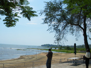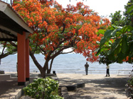 波寄せるマラウィ湖を背に、色鮮やかなジャガランダの花