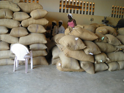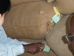 @ 各生産地から運び込まれる豆は、重量と品質が申請内容と一致しているか、受付時に生産者ごとにチェックされます。また乾燥状態が不十分な豆は返却されます。 |