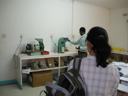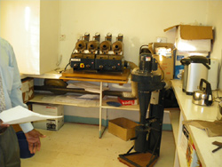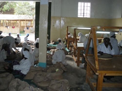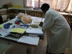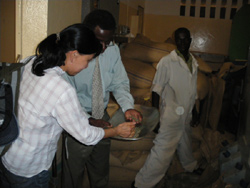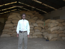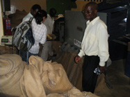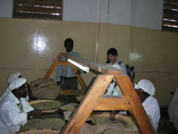 11月18日午後、組合代表カルーラ氏との面会の後、本部敷地内にあるコーヒー選別施設および品質検査施設を見学しました。案内は、カウンダ氏と、Quality Process Associate(品質管理責任者)のMr. Mcdonald Jobe(マクドナルド・ジョべ氏)です。 |
