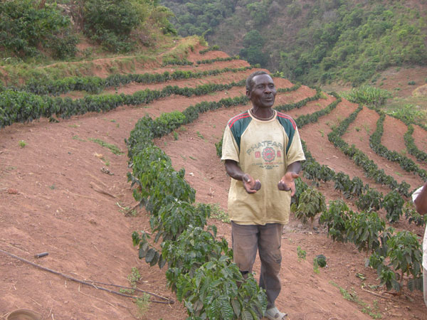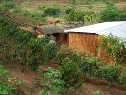 ところが山の斜面の栽培地に、若木だけが綺麗に並べて植えてあったので、「シェイド・ツリーは無いのですか?」と尋ねると、「(地域マネージャーの)指導が誤っていたのですね。来年のこの周辺の収穫量はずっと落ちるでしょう!」とカウンダ氏(ムズズ・コーヒー生産者協同組合Planning Director)の返事。ただし「一昨年、昨年と収益を上げているので、大丈夫でしょう。今まで藁屋根でしたが、トタン屋根に替わっているところも出てきています。」