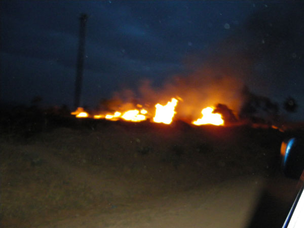 Mzuzuへの帰り道、夕闇が迫り、辺りはうっすらと白い靄に包まれました。やがて夜のとばりが下りて、高速で走る車のヘッドライトが照らす道路しか見えません。暗がりの中、遠くの山あいのあちこちに真っ赤に燃え盛る炎が見えました。まるで闇の中の花火のようで、幻想的に見えました。焼畑の赤い炎です。