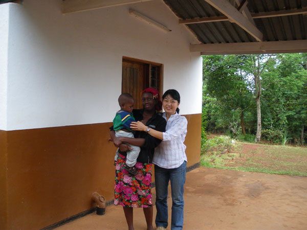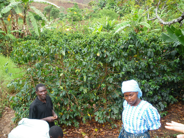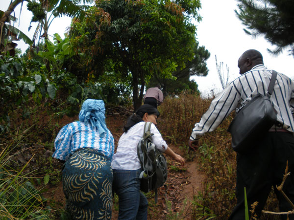 コーヒー農民のゾーン・セクレタリー、Panja(パンジャ)さんは、2001年に70本のコーヒーからはじめて、現在は3,000本まで増えていると話してくれました。同じコーヒー農民のビジネス・センター責任者、Macdonald(マクドナルド)さんは、1999年にMzuzu Unionの支援でコーヒー栽培を始めたそうです。もっと生産率を高めたいので、良質の肥料が欲しいと話していました。マクドナルドさんのチャーミングな奥さんが、急な山道で手を取ってくれました。