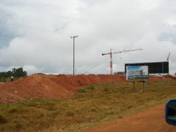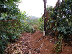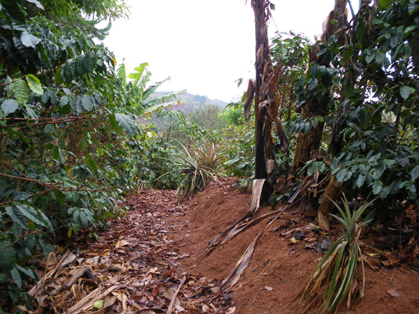 現在は10km先のウォッシング・ステーションまでチェリーを運ばなければならないそうです。そこで、栽培地から数100m先の山の中腹に、斜面の勾配を生かして新たに大規模なステーションを建設していました。洗浄で使う水は、近くの川から土中に埋め込んだパイプを通して引いてくるとのことでした。土中のパイプが顔を出して水溜りができていました。豊富な水源を利用して豆を洗浄し、美味しいコーヒーができるのですね。