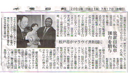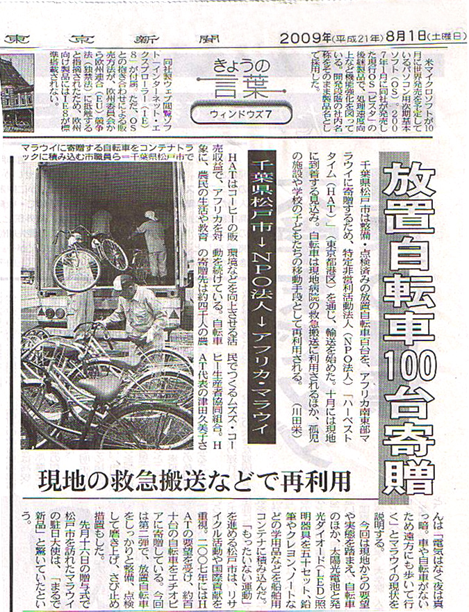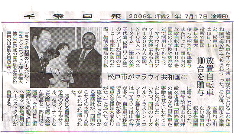このたびのマラウィへの自転車贈与については、地元TV(2社)のニュース番組および日刊紙(2紙)で報道されました。クリックすると「8月1日付東京新聞」「7月17日付千葉日報」の記事がご覧になれます。 |