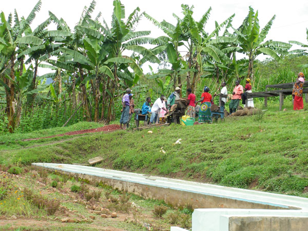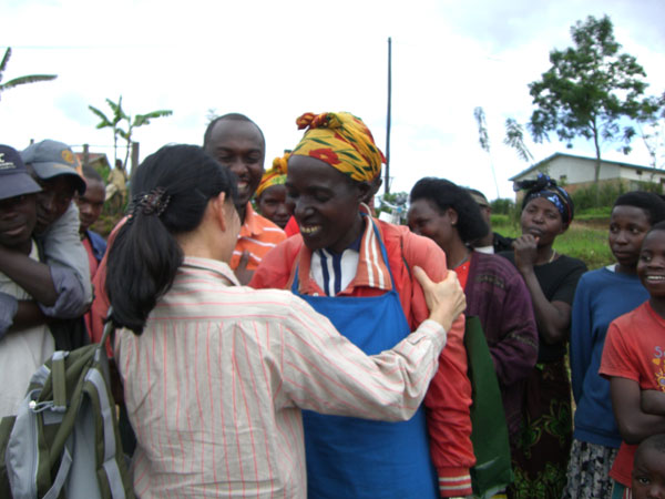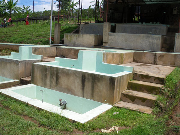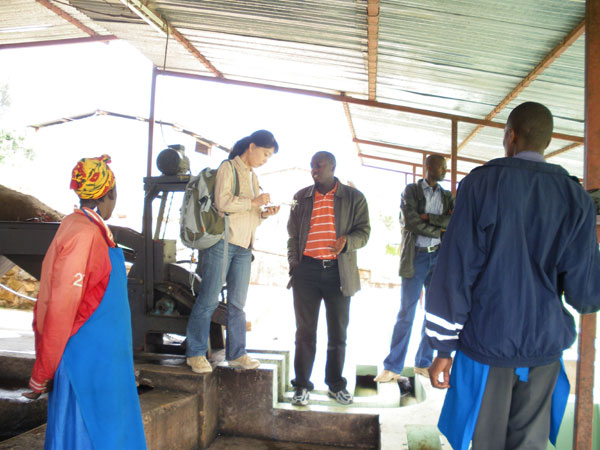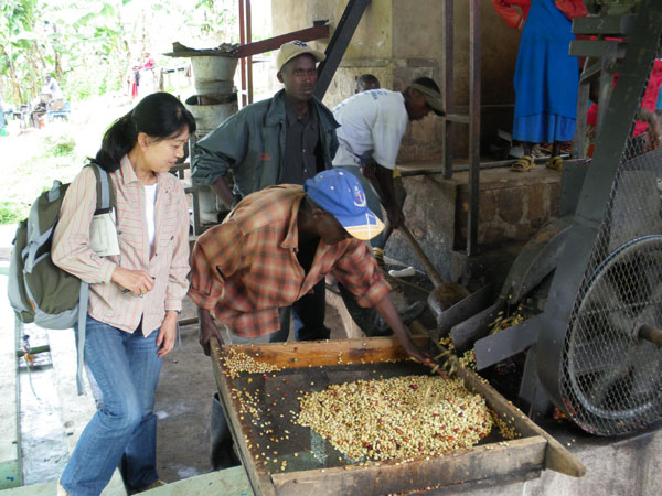 目的地のAbkundakawa Rushoshi(標高約1,800メートル)へは、キガリから約3時間弱のドライブ。4WDの車でぬかるんだ山道をあえぐように登り、ようやくウォッシングステーションにたどり着きました。この辺り一帯(約100ヘクタール)で、コーヒーを栽培しているとのこと。このウォッシングステーションは、ジェノサイドで未亡人になった女性達(ウーメンズ・アソシエーション)が中心となり運営しています。 |