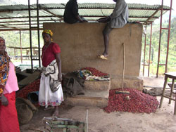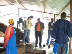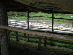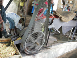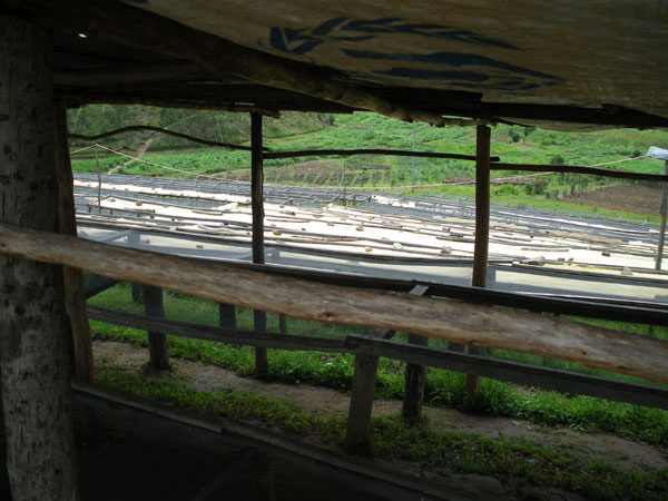 幸い5分ほどするとモーターが回りだし、ステーションが稼動し始めました。農民達は歓声を上げ、歌や踊りで喜びを表現し、早速作業開始。こちらもつられて万歳!と叫んでいました。Kevin氏の説明によると、洗浄した豆は直ぐに天日干しするのではなく、先ずビニールで覆った棚で干されるとのことで、いきなり天日にさらすと、豆の色が白くなるからとの説明でした。 |