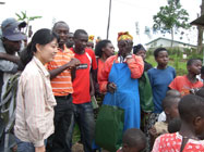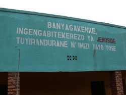 ふとレストランの向かい側の家々を見ると、どの家の壁にも同じ文章が書かれています。「JENOSIDE」と記された文字だけ色が違うので、意味を尋ねると、村のキャンペーンで「二度とジェノサイドは起こさない!」という内容を、各家々に掲げているのだとの事。一緒に食事をしていたKevinさんが「僕も両親と6人の兄弟を殺された。しかも誰(近隣の人)が殺したかが分かっているので辛い。」 と、ポツリと語り出しました。一瞬何と言って良いか言葉に詰まりました。 |