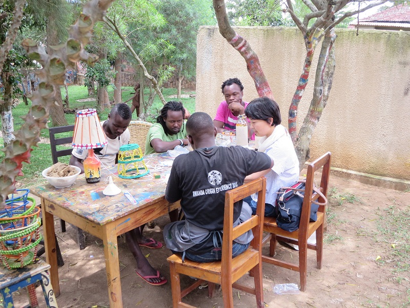 さてその後は、新製品の紹介です。新製品とは、捨てられるペットボトルを使い、ルワンダの伝統的なアガセチェとの組み合わせで作るランプシェードです。果たしてアーティストたちの反応は?いささか不安でしたが、彼らは高い関心を示し、より素敵な製品にしたいとの試作しながらの話し合いになりました。